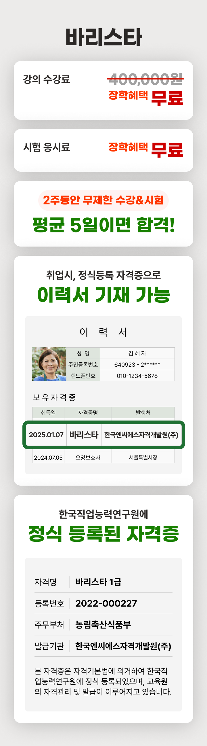 상기 바리스타 1급 자격은 자격기본법 규정에 따라 등록한 민간자격으로, 국가로부터 인정받은 공인자격이 아닙니다.