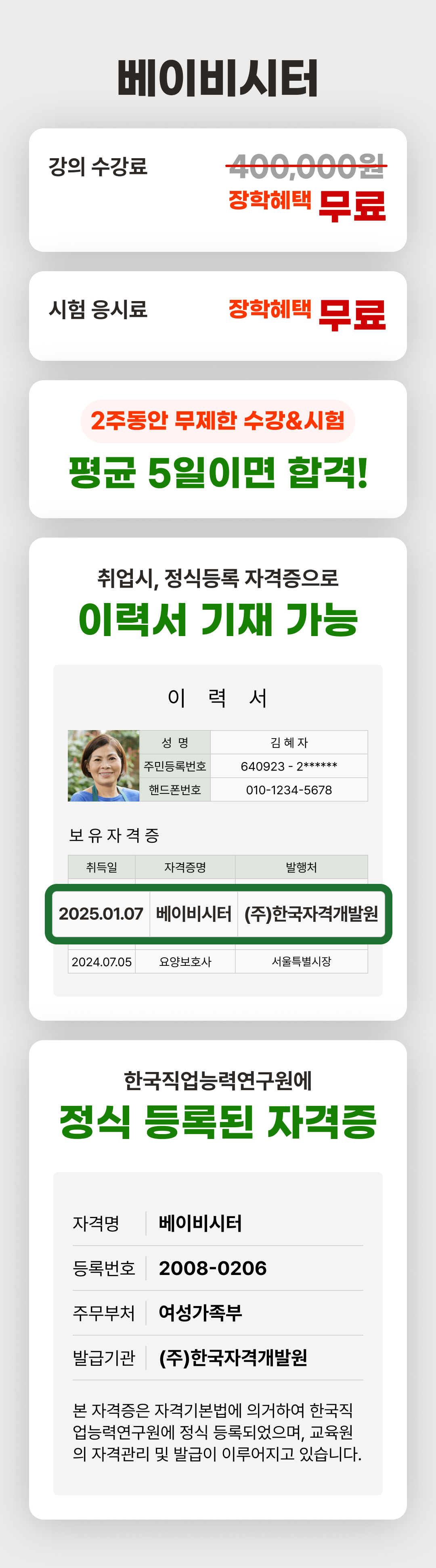 상기 베이비시터 자격은 자격기본법 규정에 따라 등록한 민간자격으로, 국가로부터 인정받은 공인자격이 아닙니다.