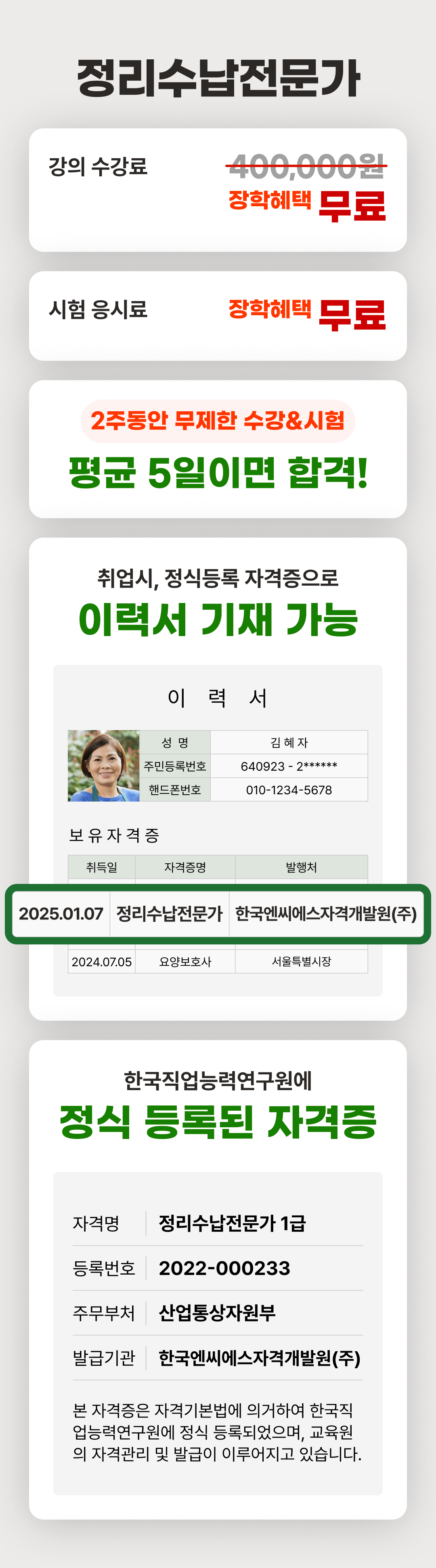 상기 정리수납전문가 1급 자격은 자격기본법 규정에 따라 등록한 민간자격으로, 국가로부터 인정받은 공인자격이 아닙니다.