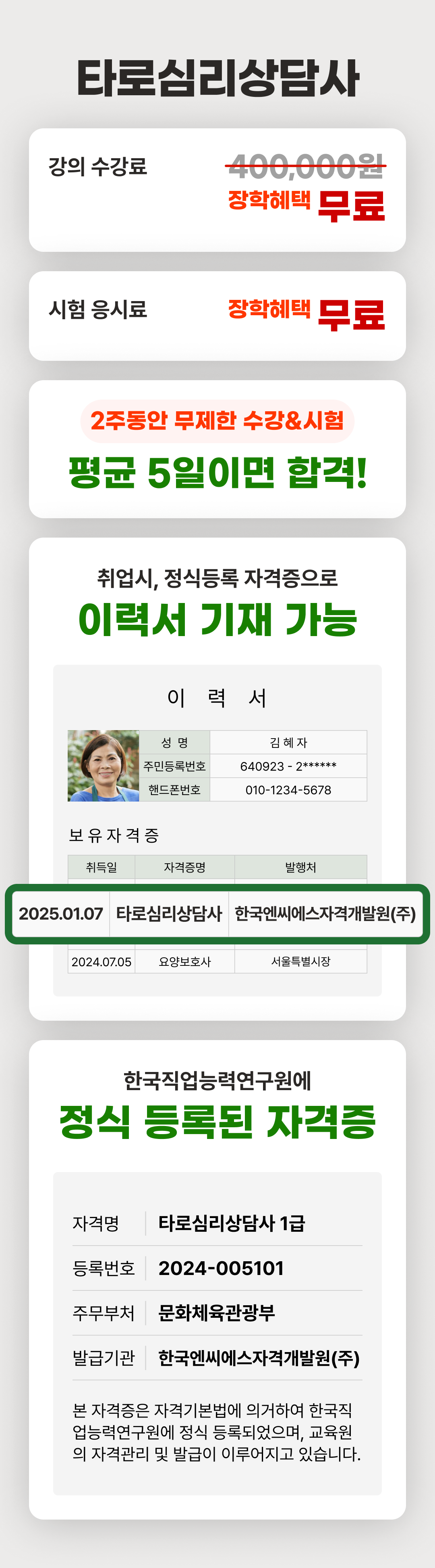 상기 타로심리상담사 1급 자격은 자격기본법 규정에 따라 등록한 민간자격으로, 국가로부터 인정받은 공인자격이 아닙니다.