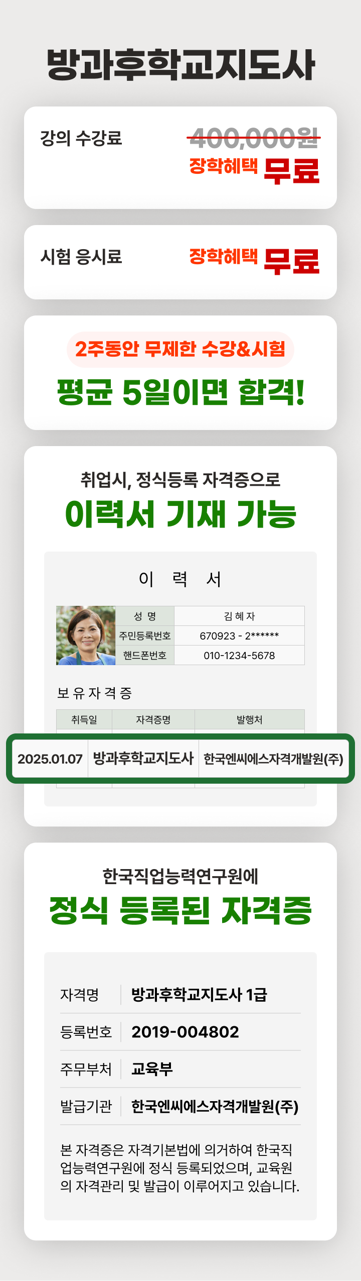 상기 방과후학교지도사 1급 자격은 자격기본법 규정에 따라 등록한 민간자격으로, 국가로부터 인정받은 공인자격이 아닙니다.